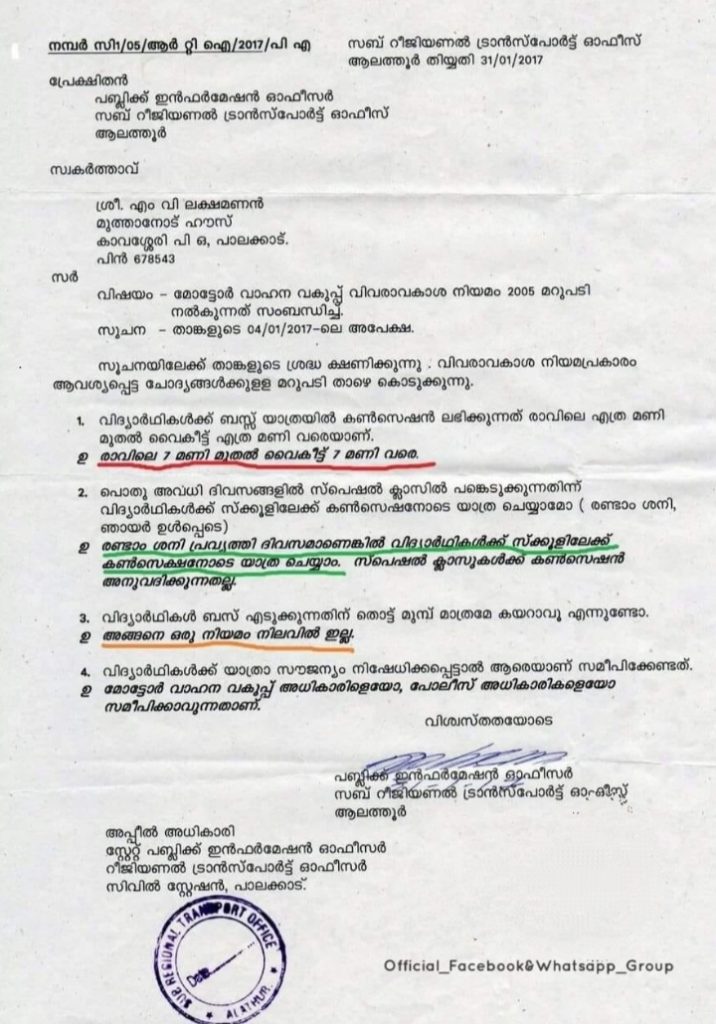 തിരുവനന്തപുരം: രാവിലെ 7 മുതൽ രാത്രി 7വരെ വിദ്യാർഥികൾക്ക് ബസ്സ് യാത്രയിൽ കൺസെഷൻ ലഭിക്കുമെന്ന് 2017ലെ വിവരാവകാശ രേഖ. പാലക്കാട് ആലത്തൂർ സബ് റീജിയണൽ ട്രാസ്പോർട്ട് ഓഫീസർ നൽകിയ വിവരാവകാശ മറുപടിയിലാണ് വിദ്യാർത്ഥികൾക്ക് ബസിൽ ലഭിക്കേണ്ട കൺസെഷൻ സംവിധാനങ്ങൾ വിവരിക്കുന്നത്. ബസ് യാത്രയുമായി ബന്ധപ്പെട്ട് വിവിധ ഭാഗങ്ങളിൽ വിദ്യാർഥികൾ വ്യാപകമായ പരാതി ഉന്നയിക്കുന്ന സാഹചര്യത്തിലാണ് വിദ്യാർത്ഥികൾക്ക് …